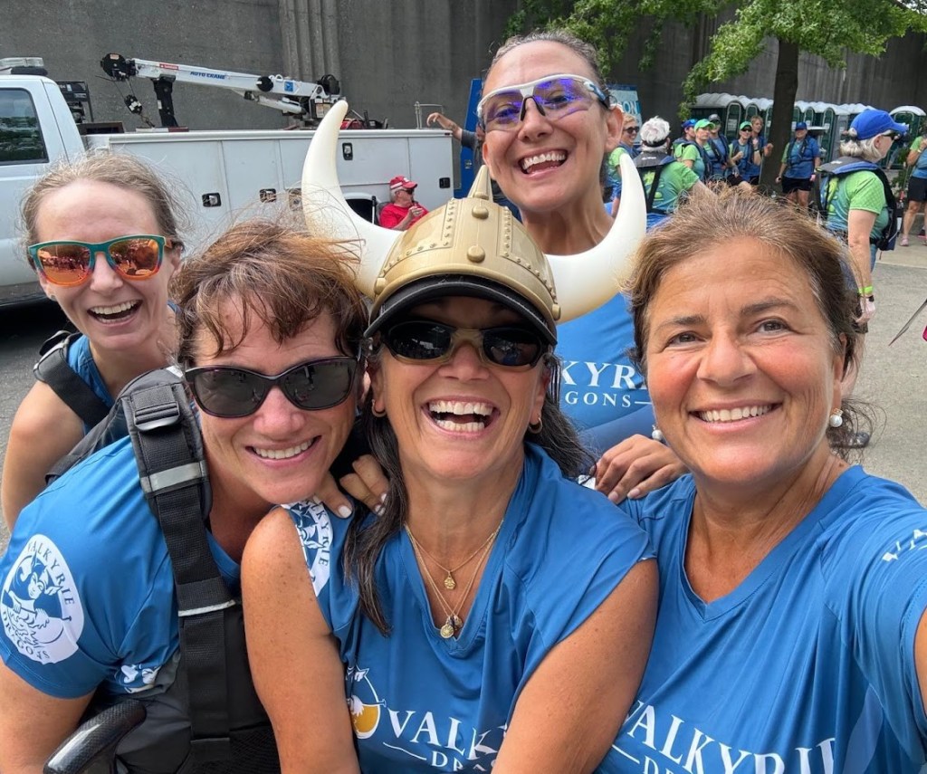 To learn to work together as a team, and find your place on the boat, it is important to attend practice regularly. Wear comfortable exercise clothes that you can move in that dry quickly and water shoes. Bring a towel, water bottle, sunscreen, bug repellent, and a change of clothes. Practices are free for paying members, and guests are welcome with a free two-practice trial.