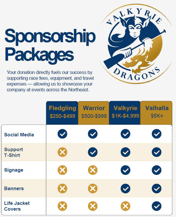 The Valkyrie Dragons work hard both on and off the water, and we stay strong through the finish line. We will apply that same level of commitment to you, implementing a sponsorship plan that will promote your brand in a new and exciting way. From shirts to banners, let us bring your brand to the finish line!